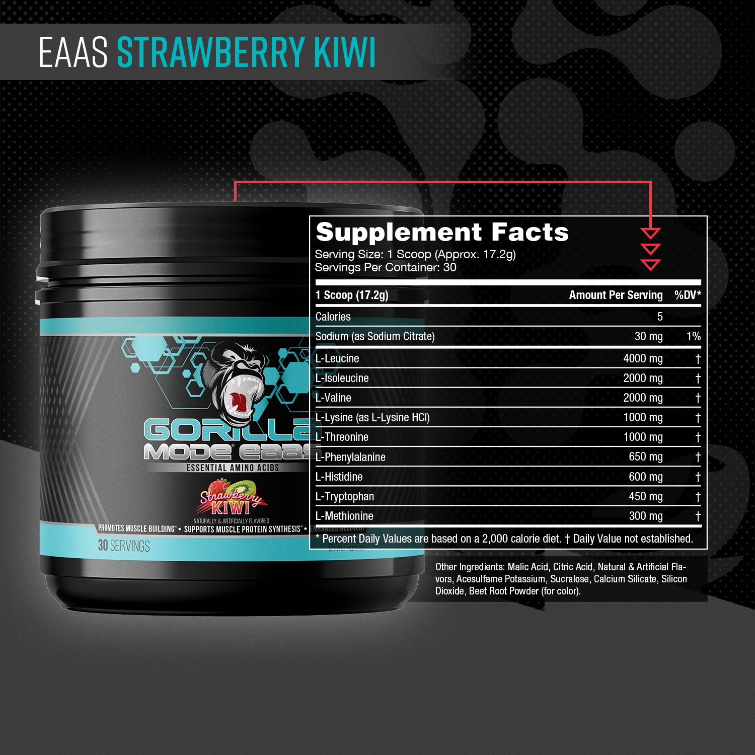 Essential Amino Acids (EAA’s) are required to build new muscle tissue and help with cell repair, which occurs when muscles are recovering. They are essential because your body cannot produce them. EAA’s must come from your diet or supplementation [R]. As such, we have created Gorilla Mode EAA’s, which, like all of our products, are turn-key and provide the optimal dosage required per day for each essential amino acid. Containing a total of 12 Grams of EAAs in 1 scoop, it is one of the highest-dosed EAA products in the industry.