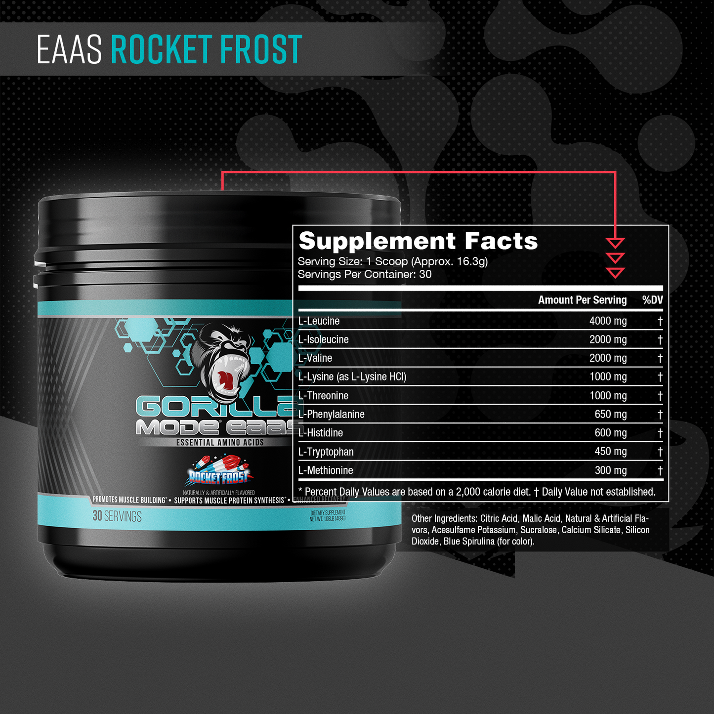Essential Amino Acids (EAA’s) are required to build new muscle tissue and help with cell repair, which occurs when muscles are recovering. They are essential because your body cannot produce them. EAA’s must come from your diet or supplementation [R]. As such, we have created Gorilla Mode EAA’s, which, like all of our products, are turn-key and provide the optimal dosage required per day for each essential amino acid. Containing a total of 12 Grams of EAAs in 1 scoop, it is one of the highest-dosed EAA products in the industry.