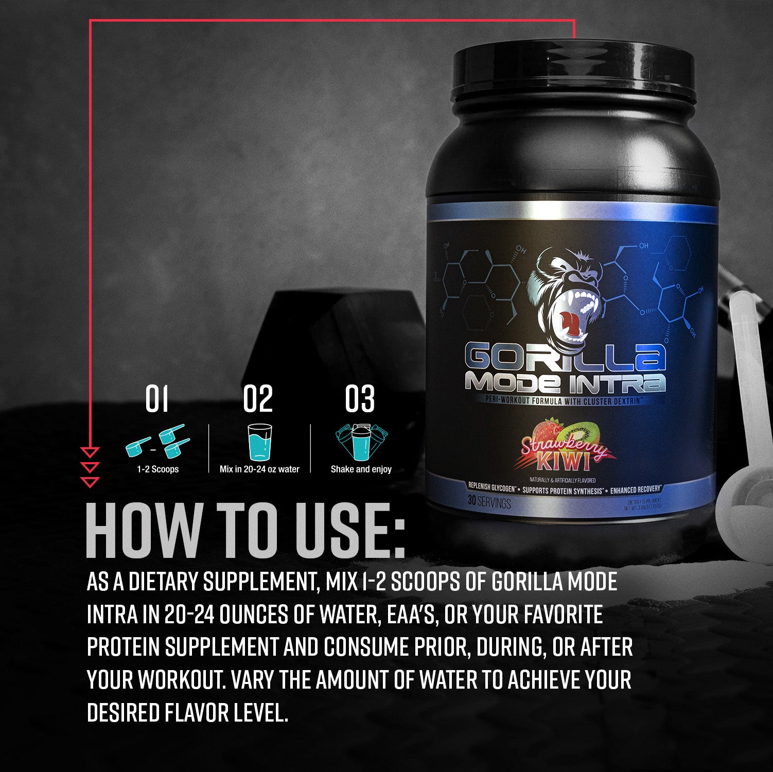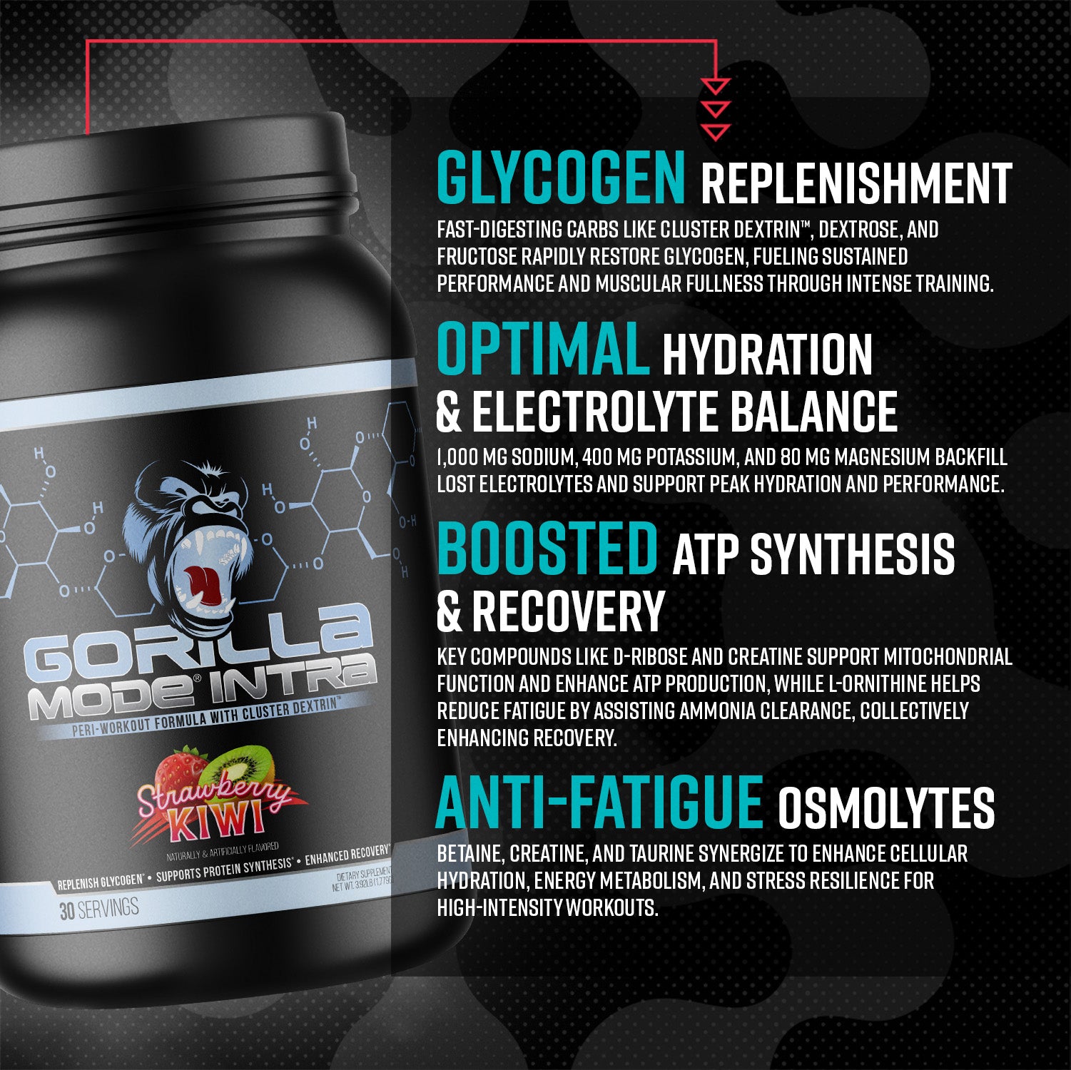 Gorilla Mode® ‘Intra’ is our upgraded and fully loaded peri-workout formula (formerly post-workout) to support both intra-workout performance, and post-workout recovery.